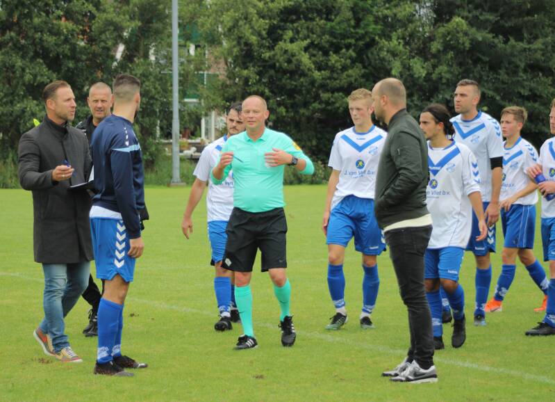 Op de foto geheel links Guillaume Groot in de wedstrijd KFC-Saenden op het toernooi van vv Assendelft afgelopen zomer. De andere trainer op de foto is René Reijinga die dus volgend seizoen de omgekeerde weg bewandeld en bij KFC aan de slag gaat.