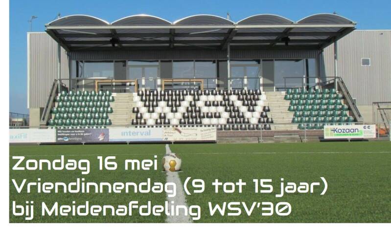 Voor alle meiden in de leeftijd van 9 tot 15 jaar die het leuk vinden om te voetballen, organiseert WSV'30 zondag 16 mei een Vriendinnendag op haar complex. Tussen 10.30 uur en 13.00 uur worden er allerlei voetbalspelletjes en partijtjes.gehouden om op een leuke manier kennis te maken met het meiden voetbal bij WSV'30. Naast de eigen leden kan iedereen, die bijvoorbeeld nog twijfelt om op voetbal te gaan of het misschien nog spannend vindt om alleen te komen trainen, zich opgeven voor deze voetbalochtend!