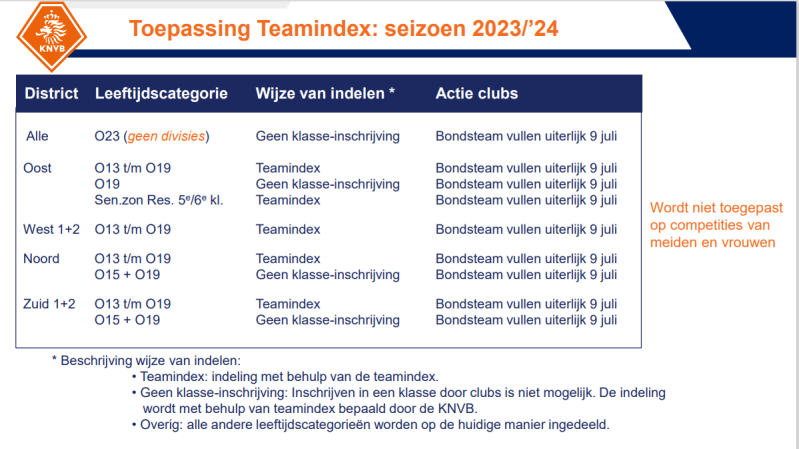 Los van het gebruik van de Teamindex is ook het verzoek om voor de teams die zijn ingeschreven voor deelname aan de competities voor de MO13 t/m MO20 uiterlijk 9 juli de bondsteams te vullen. Niet zozeer omdat de Teamindex wordt gebruikt voor een competitie-indeling, maar omdat er sprake is van nieuw aanbod van competities wil de KNVB zowel de indelingen, competities als de resultaten van de teams goed monitoren. Hiervoor hanteert de KNVB een dashboard waarbij de samenstelling van de teams van grote waarde is.