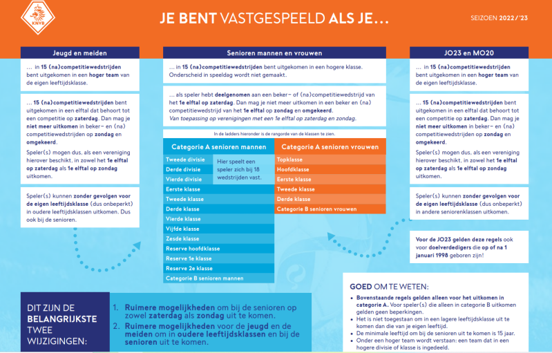 De regels met betrekking tot de inzet van spelers in categorie A van het veldvoetbal zijn met ingang van het seizoen 2022/’23 gewijzigd. De belangrijkste veranderingen voor het seizoen 2022/'23: